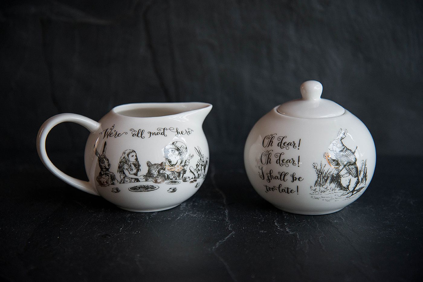 Take a nostalgic journey into Wonderland with this delightful set of four side plates. These side plates will make a wonderful addition to any meal time and are made from fine china, for lasting strength and beauty. They're printed with black and white illustrations, inspired by an Alice in Wonderland card game based on artwork by Sir John Tenniel (1820 - 1914). A hint of gold decal adds a luxurious touch to already beautiful designs, while the iconic ‘oh dear! oh dear! I shall be too late!’ and ‘have I gone mad?’ quotes decorate two of the plates. Diameter 20.5cm.
